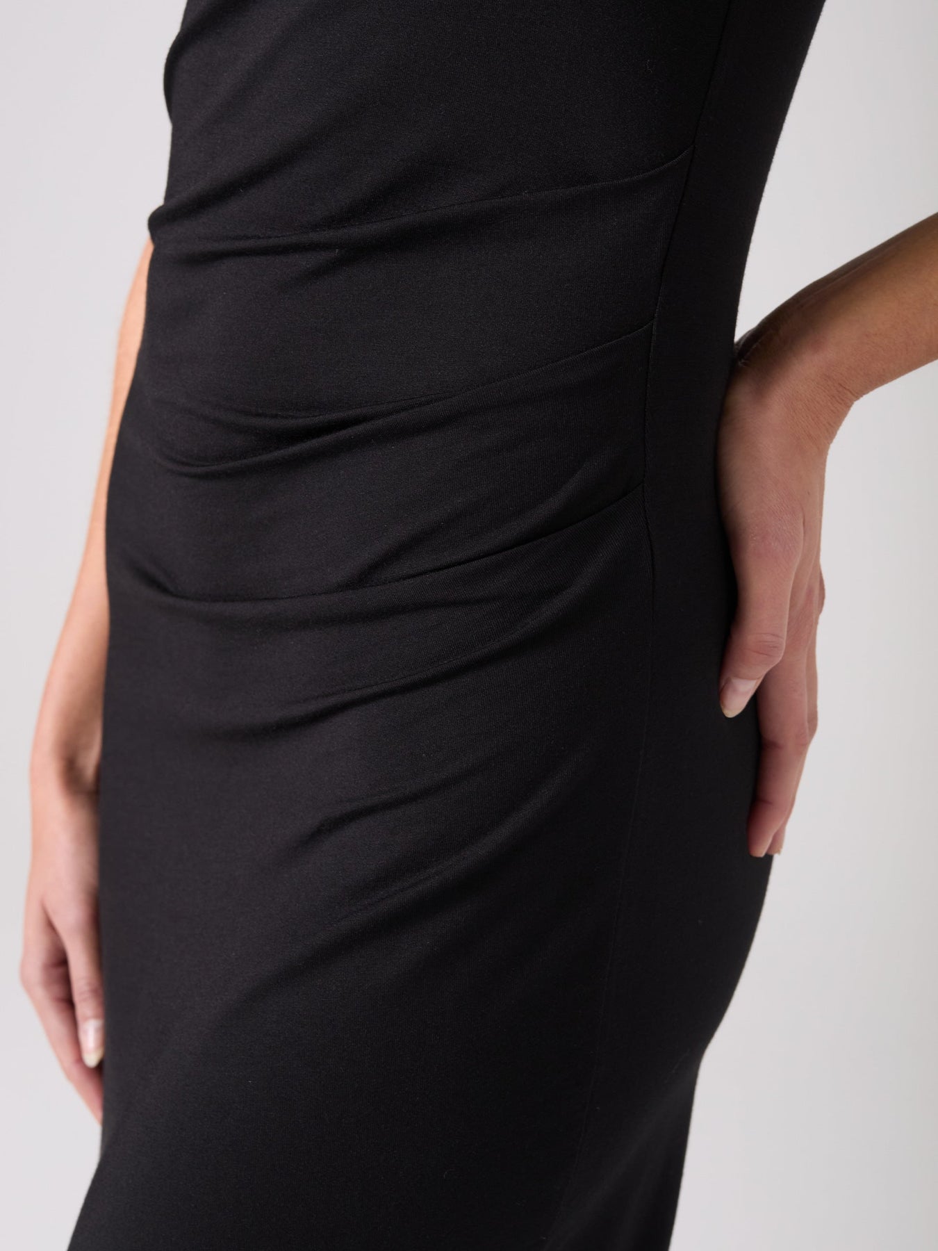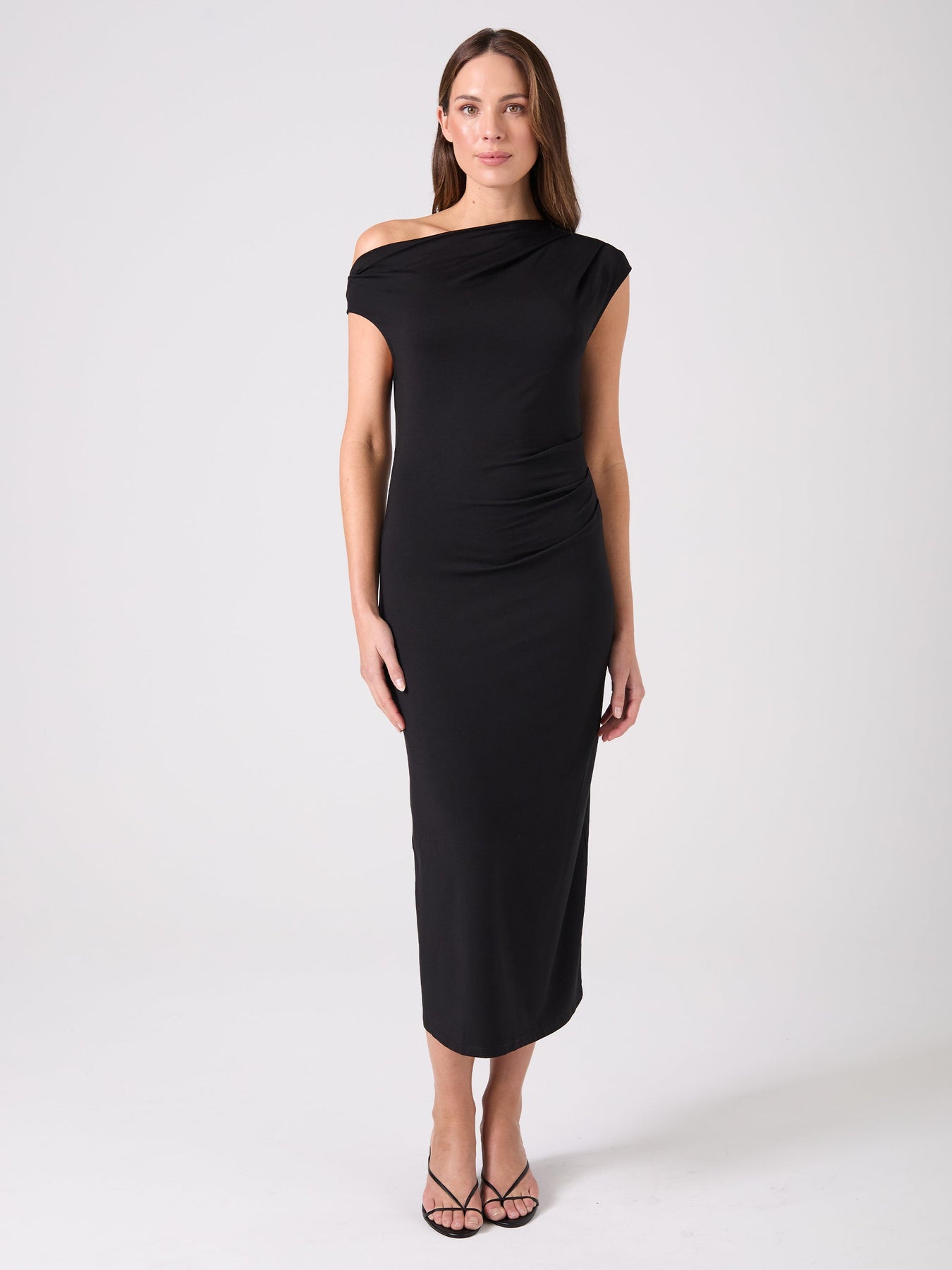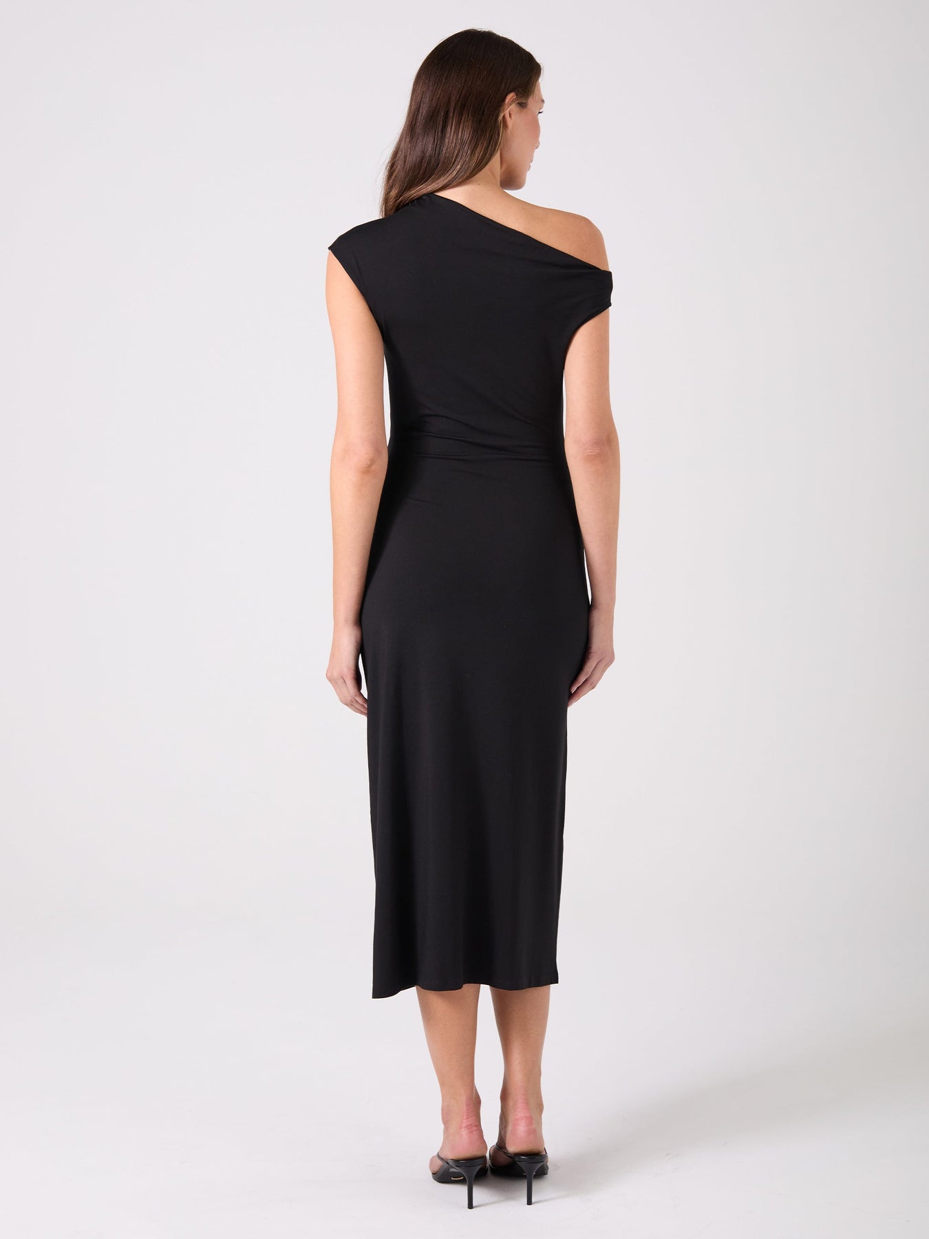 Designed with a flattering asymmetric hem and gently gathered side ruching, this piece celebrates the feminine silhouette—enhancing your shape in all the right places. The off-shoulder neckline adds a modern, confident touch that transitions seamlessly from day to night.