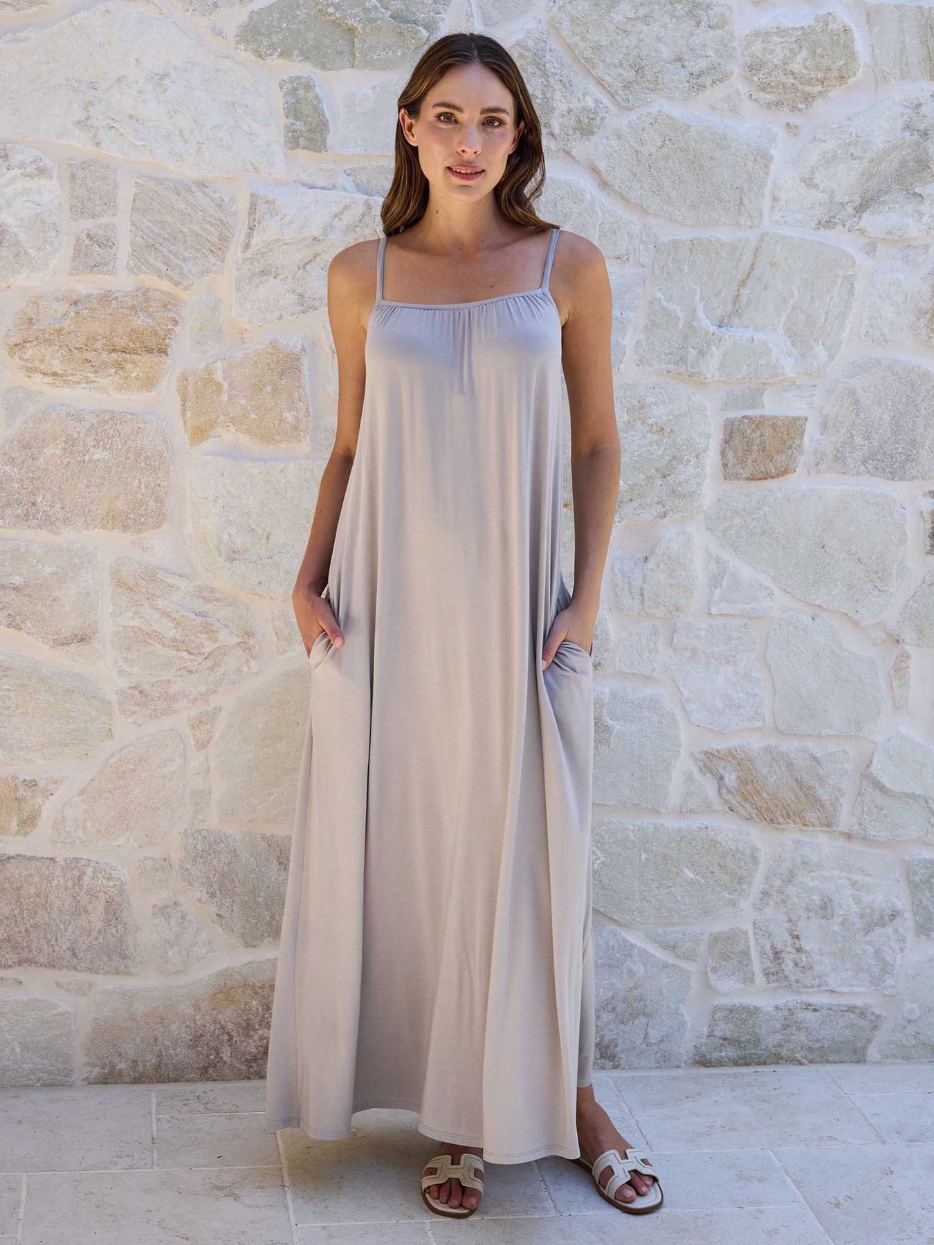 The lightweight Venice Maxi Dress in Black Light weight, non-stretch linen blend fabrication Maxi length Sleeveless V-neckline Thin adjustable straps Gathering at bust Oversized fit Slips on Sheer, due to the nature of the fabrication this garment may require layering Please see studio image for most accurate colour