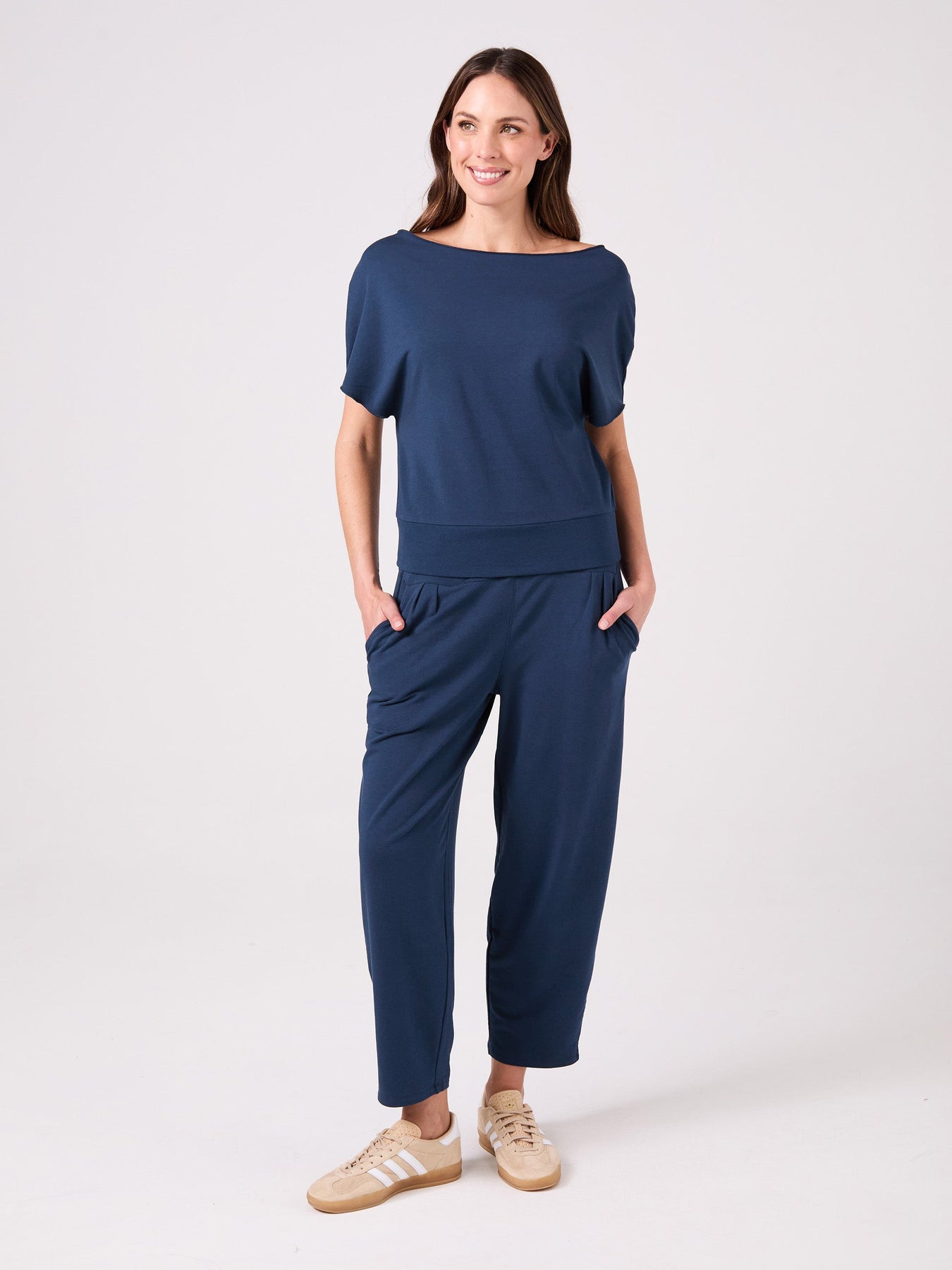 French Terry Short Sleeve Off Shoulder Sweatshirt  - Navy