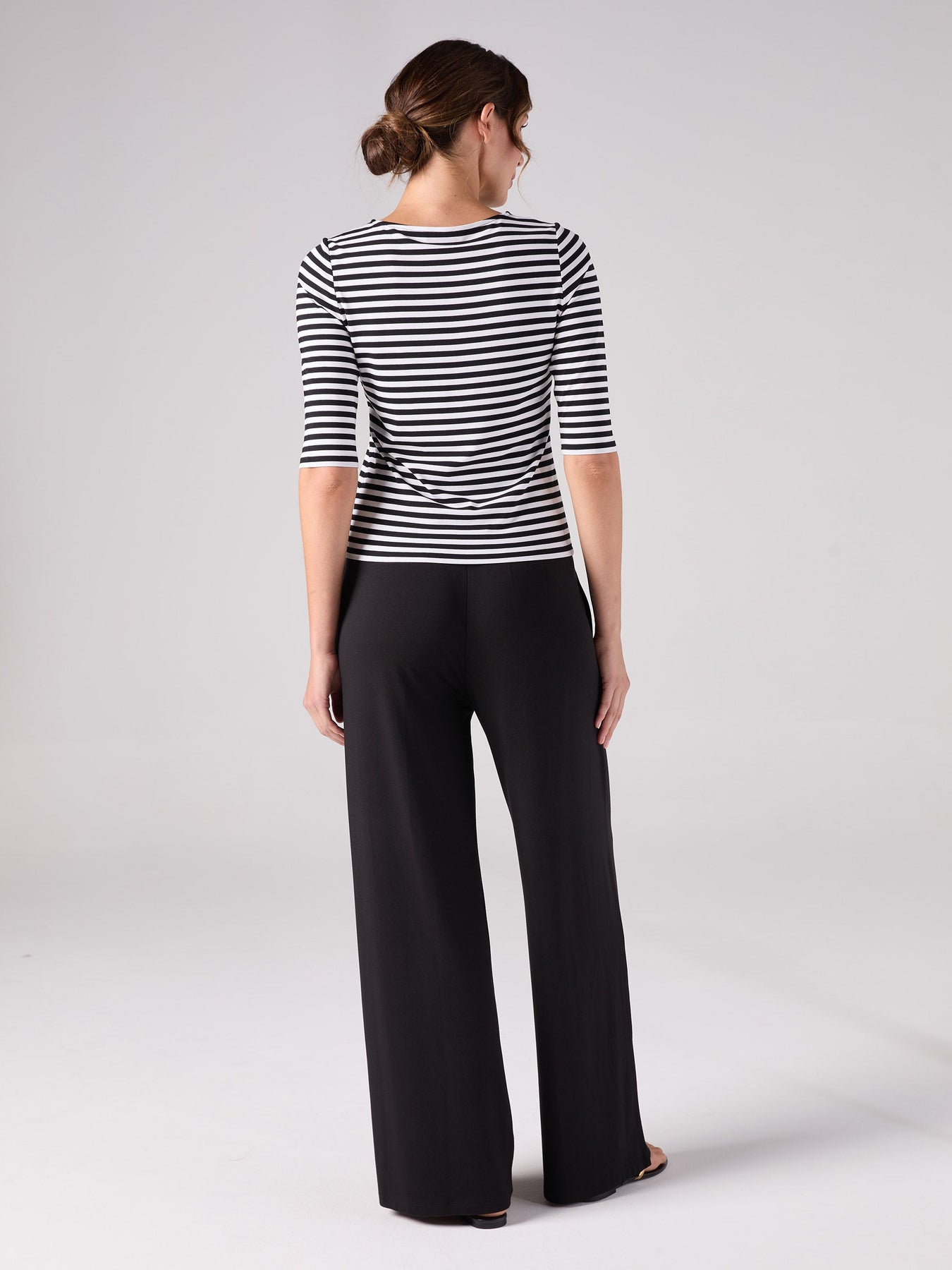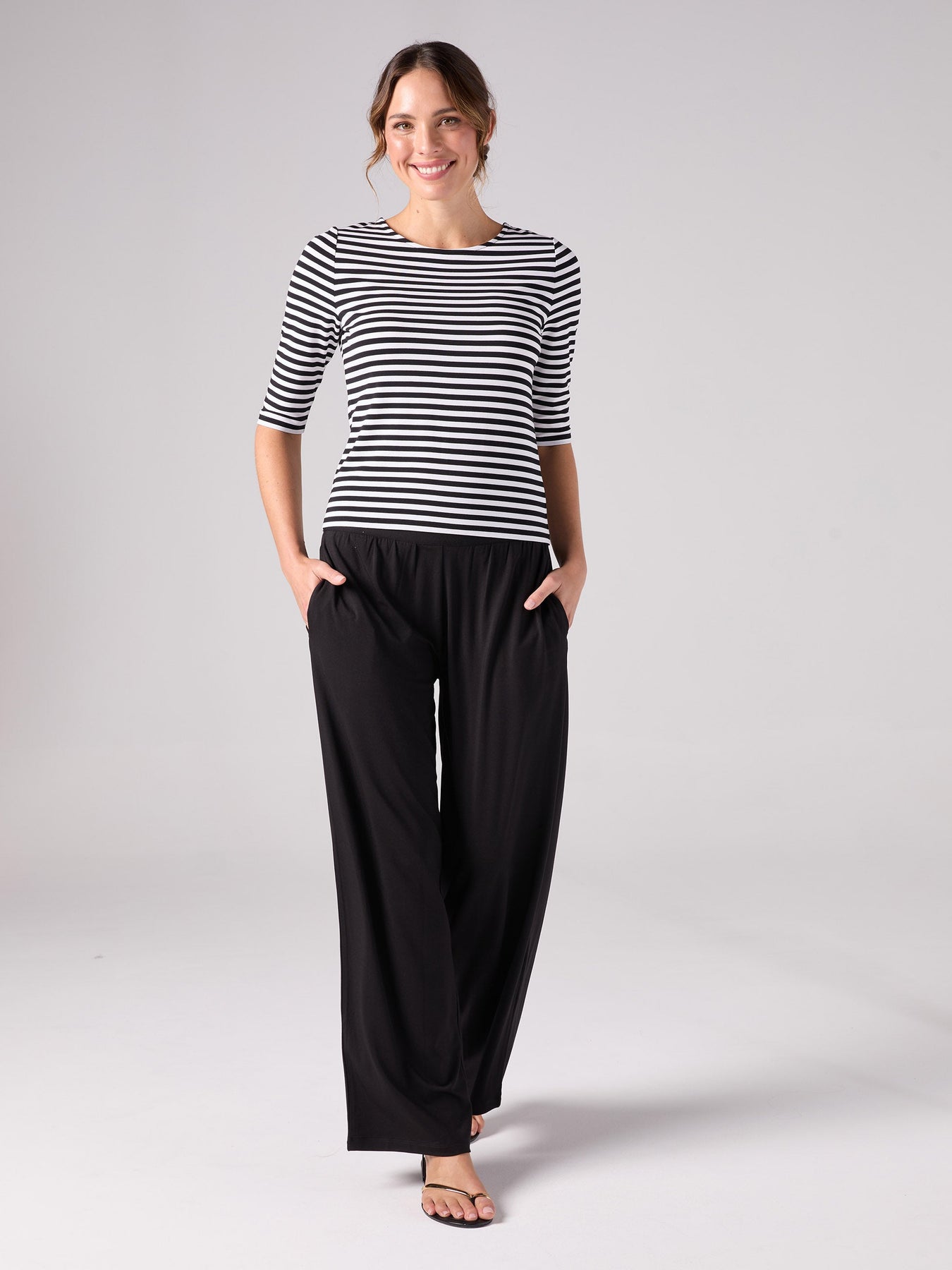 Timeless and elegant, this 7/8 sleeve tee in classic navy and white stripes brings effortless polish to everyday dressing. Crafted from our luxuriously soft Modal blend, it features a flattering fitted cut and a wide neckline that enhances its refined simplicity. Designed for versatility, it pairs seamlessly with both casual denim and elevated tailoring.